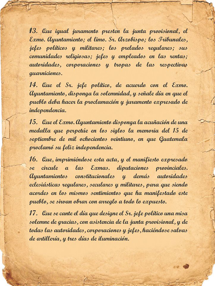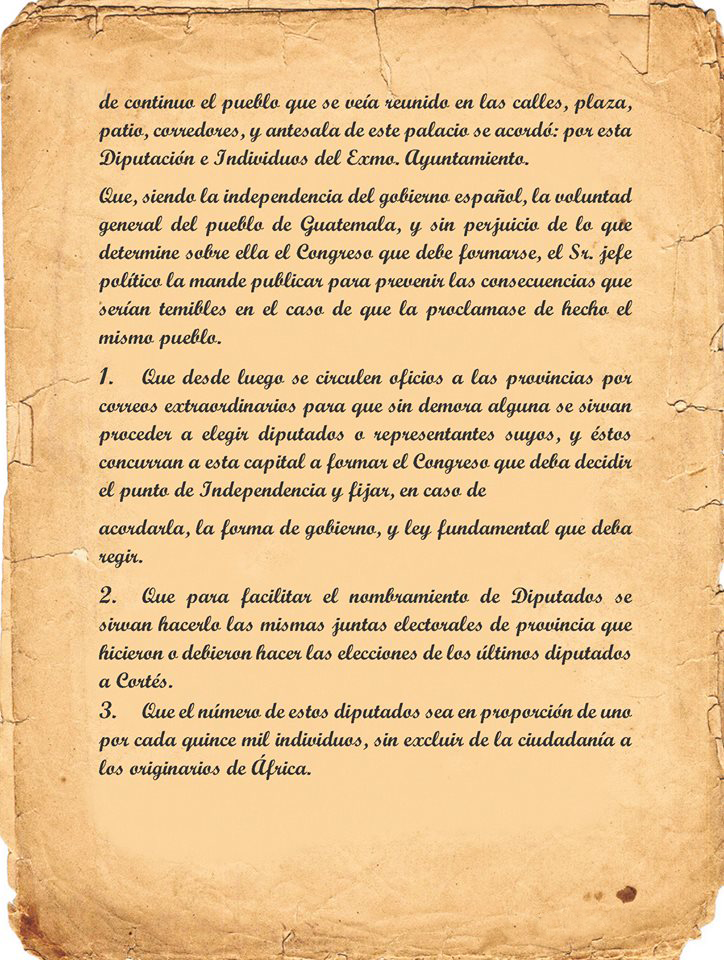 1. Que siendo la independencia del Gobierno Español la voluntad general del pueblo de Guatemala, y sin perjuicio de lo que determine sobre ella el Congreso que debe formarse, el Sr. Jefe Político lo mande publicar para prevenir las consecuencias, que serian temibles en el caso de que la proclamase de hecho el mismo pueblo.