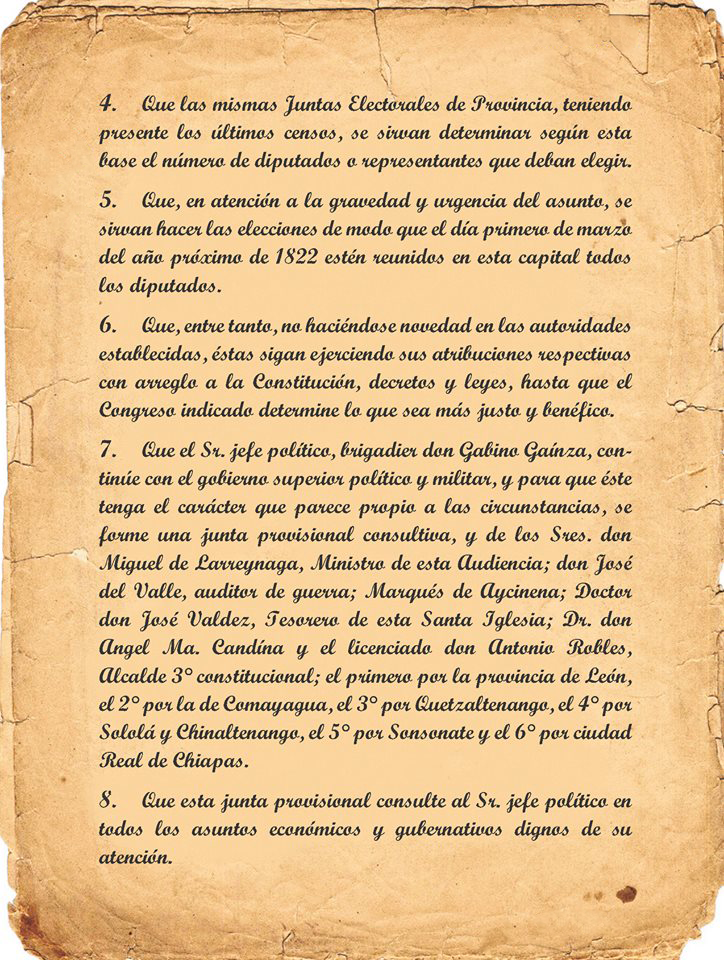 Siendo públicos e indudables los deseos de independencia del Gobierno Español, que por escrito y de palabra ha manifestado el pueblo de esta capital: recibidos por el último correo diversos oficios de los Ayuntamientos Constitucionales de Ciudad Real, Comitan y Tuxtla, en que comunican haber proclamado y jurado dicha independencia y excitan á que se haga lo mismo en esta ciudad: siendo positivo que han circulado iguales oficios á otros Ayuntamientos: determinado, de acuerdo con la Excelentísima Diputación Provincial, que para tratar de asunto tan grave se reuniesen en uno de los salones de este palacio la misma Diputación Provincial, el Ilustrísimo Sr. Arzobispo, los Señores individuos que disputasen la Excelentísima Audiencia Territorial, el Venerable Señor Deán y Cabildo Eclesiástico, el Escelentísimo Ayuntamiento, el M.I. Claustro, el Consulado y el M.I. Colegio de Abogados, los Prelados Regulares, Jefes y funcionarios públicos: congregados todos en el mismo salón: leídos los oficios expresados: discutido y meditado detenidamente el asunto; y oído el clamor de Viva la Independencia, que repetía de continuo el pueblo que se veía reunido en las calles, plaza, patio, corredores y antesala de este palacio, se acordó por esta Diputación e individuos del Esmo. Ayuntamiento: