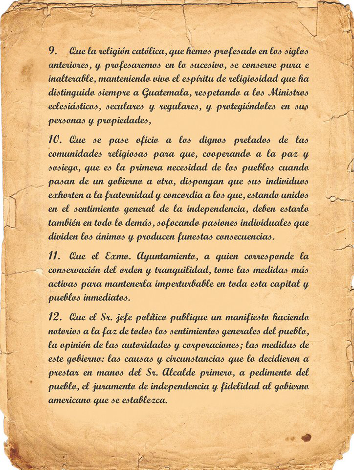 10. Que la religión católica, que hemos profesado en los siglos anteriores y profesaremos en los siglos sucesivos, se conserve pura e inalterable, manteniendo vivo el espíritu de religiosidad que ha distinguido siempre a Guatemala, respetando á los ministros eclesiásticos seculares y regulares, y protegiéndoles en sus personas y propiedades.