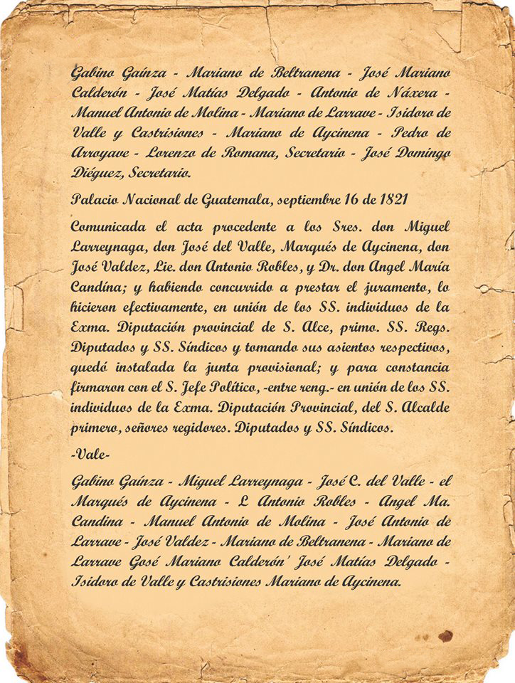 (FIRMAN) GABINO GAINZA – MARIANO DE BELTRANENA – JOSE MARIANO CALDERON – JOSE MATÍAS DELGADO – MANUEL ANTONIO MOLINA – MARIANO DE LARRAVE – ANTONIO DE RIVERA – JOSE ANTONIO DE LARRAVE – ISIDORO DE VALLE Y CASTRICIONES – MARIANO DE AYCINENA – LORENZO DE ROMAÑA, SECRETARIO – DOMINGO DIEGUEZ, SECRETARIO.